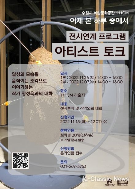 K-Classic News 최태문 기자 | 수원문화재단(대표이사 김현광) 수원시 복합문화공간 111CM은 개관 1주년 기념 전시 '어제 본 하루 중에서' 전시연계 프로그램 ‘아티스트 토크’를 이달 26일과 내달 7일 이틀 간 진행한다.
