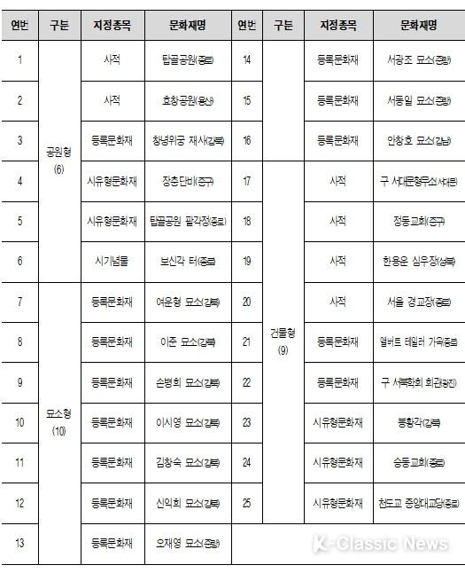 서울소재 항일독립관련문화재는 국가지정문화재 19개, 서울시지정문화재 6개다. 문화재 25건을 유형별로 살펴보면 탑골공원, 효창공원 등 공원형 문화재 6개, 안창호 묘소, 손병희 묘소 등 묘소형 문화재 10개, 경교장, 심우장 등 건물형 문화재 9개다.