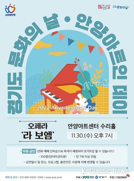 K-Classic News 최태문 기자 | 안양문화예술재단(이사장 최대호)은 경기도 문화의 날 주간을 맞아 시민의 문화 향유권 확대를 위해 30일 오후 7시 안양아트센터 수리홀에서 오페라 '라 보엠'을 공연한다.