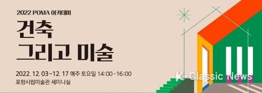 K-Classic News 최태문 기자 | 포항시립미술관은 12월 3일부터 17일까지 매주 토요일에 건축미학, 기술, 도시, 건축사와 미술, 시대 문화 등 다양한 관점에서 건축을 조명해 보는 교양강좌 2022 POMA 아카데미 ‘건축 그리고 미술’을 개최한다.