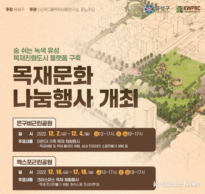 K-Classic News 최지나 기자 | 대전광역시 유성구는 오는 2일부터 4일까지, 그리고 16일부터 18일까지 지족동 은구비공원과 전민동 엑스포근린공원에서 목재친화도시 조성 플랫폼 구축을 위한 ‘목재문화 나눔행사’를 개최한다고 전했다.