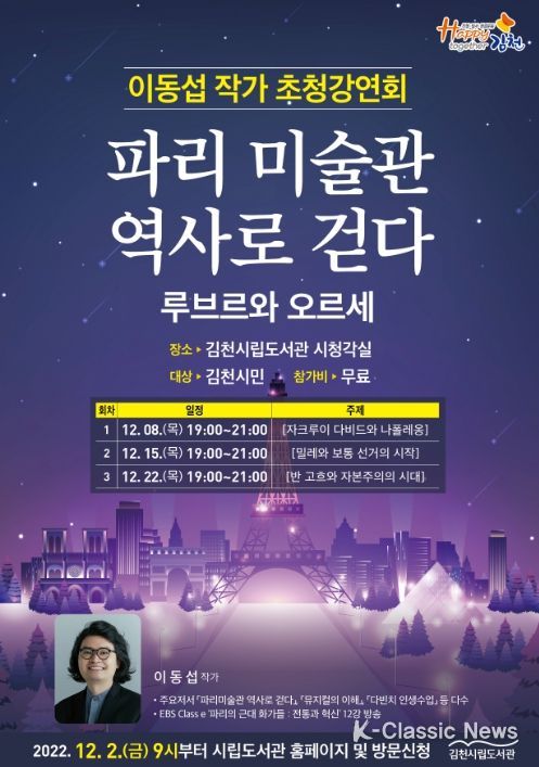 K-Classic News 최지나 기자 | 김천시립도서관은 시민의 문화와 예술을 바라보는 폭을 넓히는데 도움을 주고자 이동섭 작가를 초청하여 '파리 미술과 역사로 걷다 루브르와 오르세'를 주제로 12월 8일, 15일, 22일 3차례에 걸쳐 시립도서관 시청각실에서 강연을 펼친다.