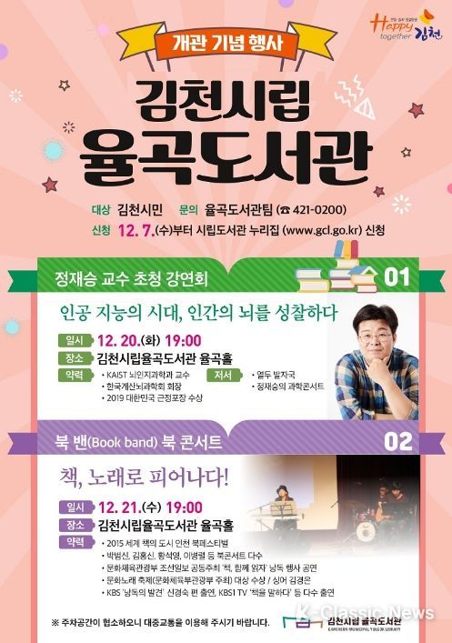 K-Classic News 최지나 기자 | 김천시립도서관은 12월 20일에 정상운영을 시작하는 율곡도서관의 개관을 기념하고자 '뇌과학자 정재승 교수 초청강연회'와 '북 밴(BOOK band)의 북(BOOK) 콘서트'를 개최한다고 밝혔다.