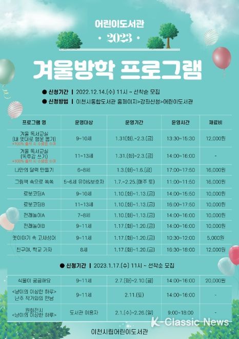 K-Classic News 최지나 기자 | 이천시립어린이도서관은 2023년 1월 3일부터 2월 26일까지 유아와 어린이를 위한 겨울방학 프로그램을 운영한다고 밝혔다.