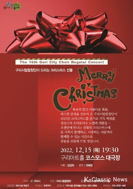K-Classic News 최지나 기자 | 구리시에서는 구리시립합창단이 오는 12월 15일 19:30부터 90분간 구리아트홀 코스모스 대극장에서 제16회 정기연주회 를 개최한다고 밝혔다.