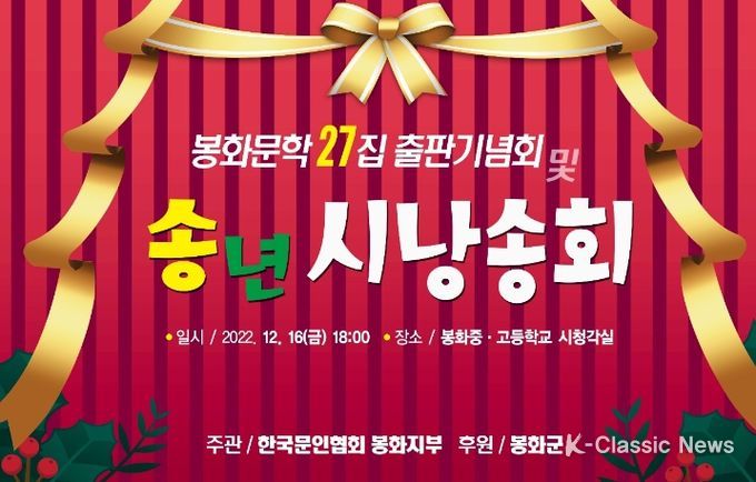 K-Classic News 최지나 기자 | (사)한국문인협회 봉화지부는 16일 오후 6시 봉화중・고등학교 시청각실에서 ‘봉화문학 27집 출판기념회 및 송년 시 낭송회’를 개최한다.
