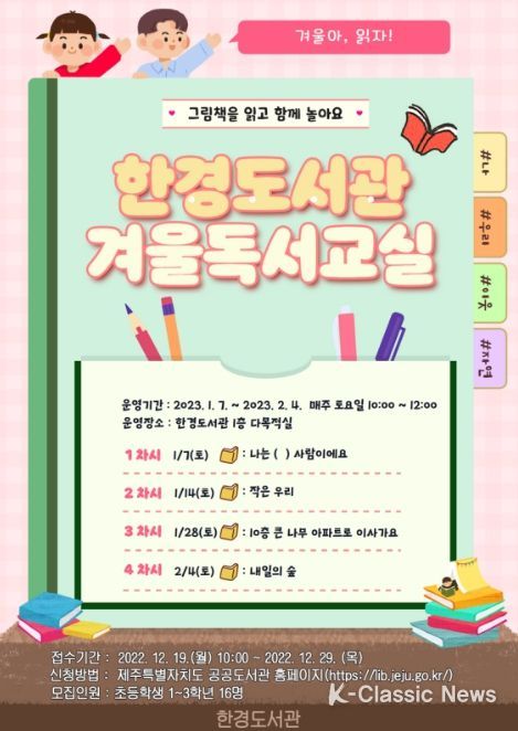 K-Classic News 최지나 기자 | 제주시 한경도서관에서는 다가오는 새해 겨울방학을 맞이하여 어린이들을 위한 겨울독서교실을 운영한다.