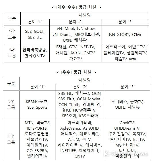 [매우우수 등급] ‘가’ 그룹에서는 SBS GOLF, tvN, tvN STORY 등 11개 채널, ‘나’ 그룹에서는 한국바둑방송, E채널, 에프티브이 등 14개 채널이 포함됐다.