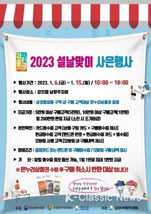 K-Classic News 김성연 기자 | 강진군은 강진읍 상권활성화구역 내 상가 매출증대와 지역경제 활성화를 위해 2023 설날맞이 강진읍상가 사은행사를 연다.