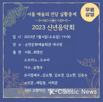 K-Classic News 김성연 기자 | 순천시는 오는 4일 저녁 7시 순천문화예술회관 대극장에서 예술의전당 2023 신년음악회를 실황 중계한다.