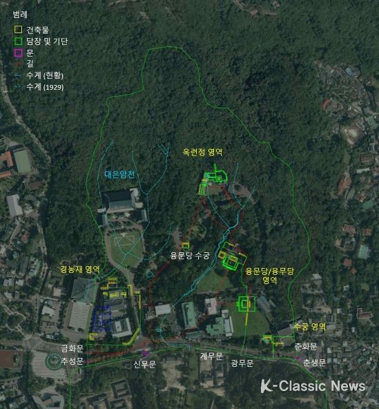 ▲ 현존 건축물과 식생 및 조경시설물 등의 연혁과 규모, 보존상태 등을 목록화했고, ▲ 일제강점기 자료와 현재의 배치도 등을 분석하여 현재 청와대 권역 담장이 경복궁 후원의 궁장(궁궐 담장) 위치와 일치한다는 점도 확인했다.
