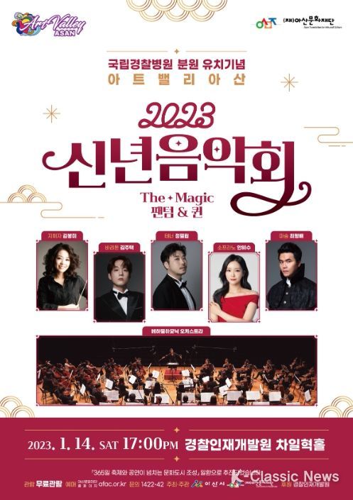 K-Classic News 최지나 기자 | 아산시가 오는 14일 오후 5시 경찰인재개발원 차일혁홀에서 국립경찰병원 분원 유치기념 ‘아트밸리 아산 2023년 신년음악회’를 개최한다.