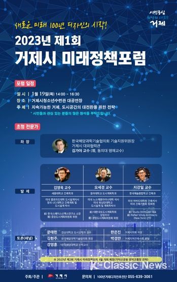 K-Classic News 김성연 기자 | 거제시는 ‘새로운 미래 100년 디자인의 시작!’이라는 슬로건으로 ‘2023년 제1회 거제시 미래정책포럼’을 오는 18일부터 19일까지 이틀간 진행한다고 밝혔다.