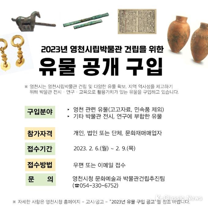 K-Classic News 최지나 기자 | 영천시가 2023년 박물관 자료 구입을 추진하려고 한다. 구입 대상은 영천 지역과 관련한 유물 혹은 박물관 전시와 연구에 부합한 각종 유물이다. 국내외 자료를 모두 포함하며, 공고문에 게재된 제외 자료와 도굴품, 도난품 등 불법 유물은 구입대상에서 제외된다.
