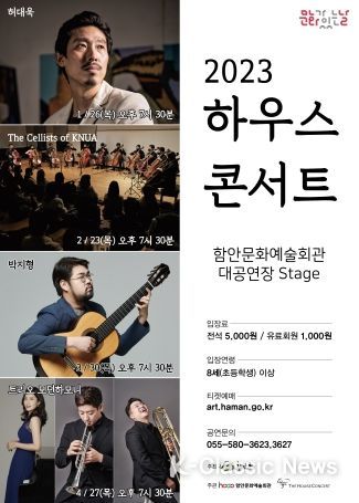 1월 하우스콘서트 공연은 전석 5000원, 유료회원 1000원이며 공연에 대한 자세한 내용은 함안문화예술회관 홈페이지를 참조하거나 전화로 문의하면 된다.