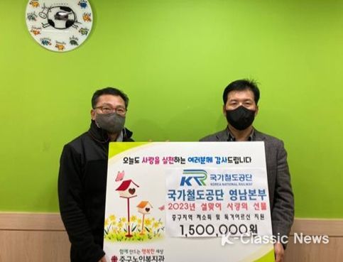 K-Classic News 김성연 기자 | 국가철도공단 영남본부는 지난 18일 부산 중구노인복지관을 방문하여 설맞이 정(情)나눔으로 온누리상품권 150만 원을 전달했다.