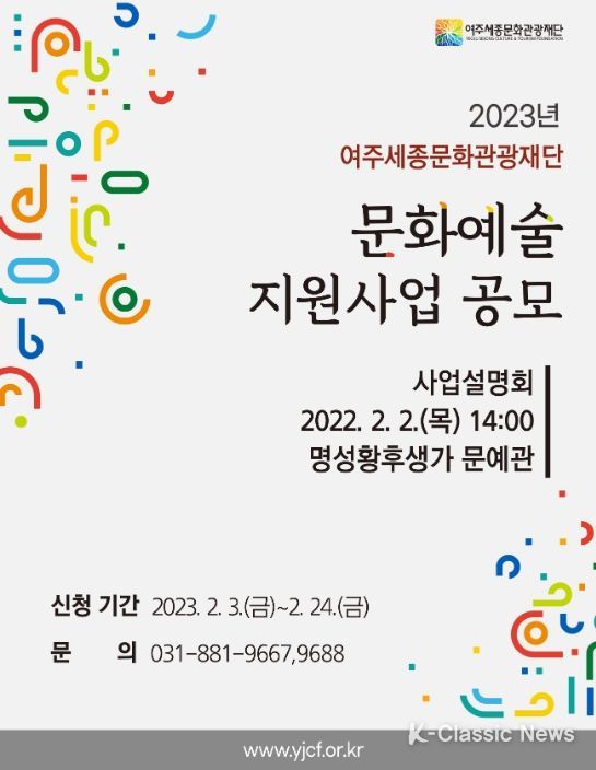 K-Classic News 최지나 기자 | 여주세종문화관광재단은 오는 2월 2일 오후 2시 명성황후 생가 문예관에서 지역 문화예술 진흥과 창작 인프라 마련을 위한 ‘2023년 문화예술 지원사업’설명회를 개최한다.