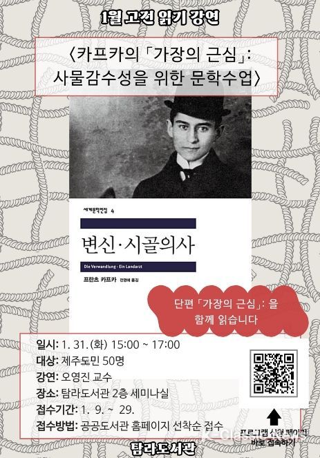 K-Classic News 최지나 기자 | 제주시 탐라도서관에서는 오는 1월 31일 화요일 오후 3시 탐라도서관 세미나실에서 '카프카의『변신·시골의사』오영진 문학평론가' 강연이 진행된다.