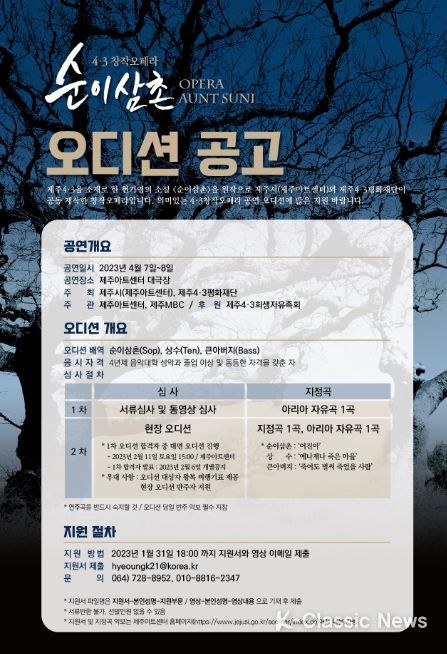 제주아트센터는 “의미있는 4․3 창작오페라 공연 오디션에 많은 관심 부탁드린다.”라고 말했다.