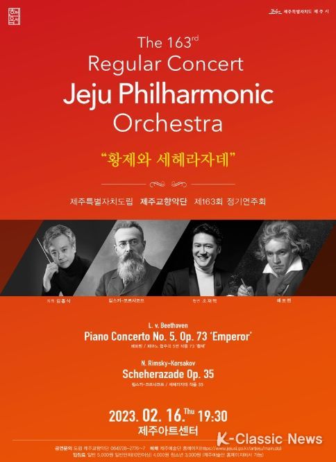 공연의 첫 번째 순서인 베토벤 피아노 협주곡 제5번 작품 73 ’황제’는 베토벤이 악화된 난청으로 매우 힘든 시기에 작곡했음에도 피아노 협주곡의 정점을 이루는 역작이며, 2부의 ‘세헤라자데 작품 35’는 천일야화로 불리는 중동 민화집 '아라비안나이트'를 소재로 한 이국적인 교향시로 제주교향악단의 화려한 관현악 연주로 공연을 수놓을 예정이다.