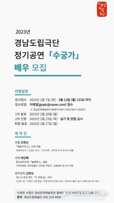 K-Classic News 최지나 기자 | 경남도립극단은 2023년 상반기 정기공연 연극 ‘수궁가’에 참여할 배우를 공개 모집한다.
