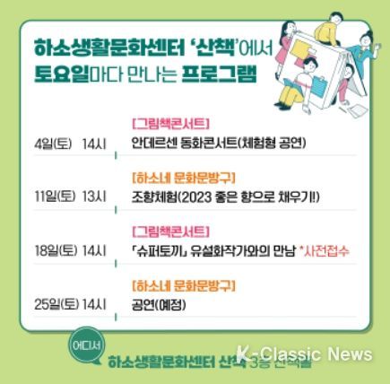 지난 4일 밴드 판과 함께하는‘안데르센 동화콘서트’가 열렸고, 11일 조향체험, 2023년 좋은 향으로 채우기, 18일 '슈퍼토끼', '슈퍼거북' 유설화 작가와의 만남 등을 진행할 예정이다.