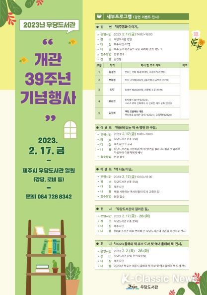 K-Classic News 최지나 기자 | 제주시 우당도서관에서는 2월 17일, 개관 39주년 기념 행사를 개최한다고 밝혔다.