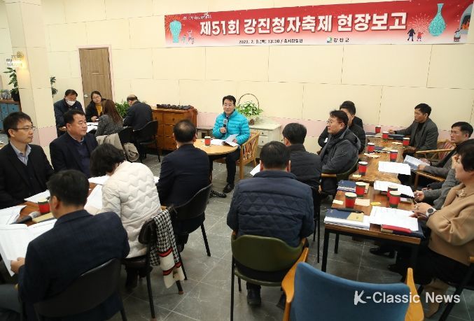 K-Classic News 최지나 기자 | 강진군은 겨울이 닫히고 봄이 열리는 계절, 4년 만에 대면으로 열리는 제51회 강진청자축제의 성공적인 개최를 위해, 9일 강진원 군수 주재로 군청 전 실·과·소장, 읍·면장이 대구면 청자촌에서 축제 진행사항 현장보고회를 가졌다.