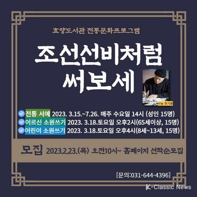 K-Classic News 최지나 기자 | 이천시 효양도서관에서는 우리 선현들이 남긴 문화유산 중 가장 고귀한 정신이 담긴 서예의 우수성을 알리고 익힐 전통문화프로그램 '조선 선비처럼 써보세'을 운영한다.