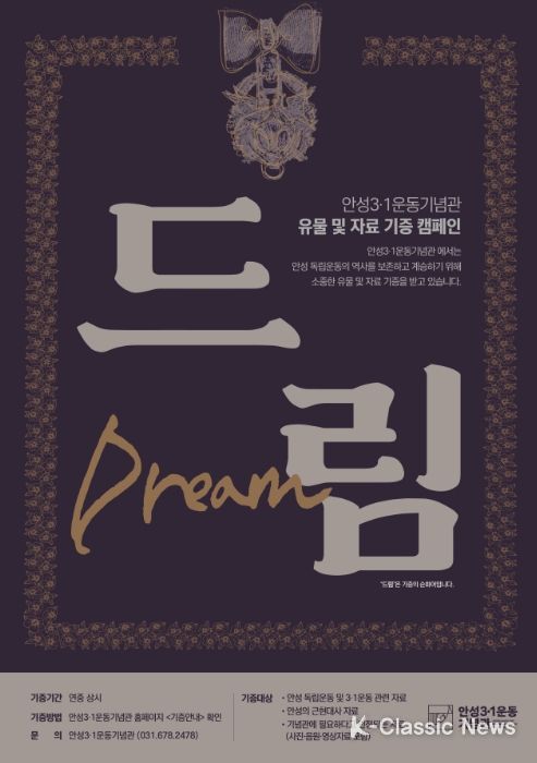 K-Classic News 최지나 기자 | 안성3.1운동기념관에서는 안성 독립운동의 역사를 보존하고 계승하기 위해 유물 및 자료 기증 캠페인 ‘드림(Dream)’을 펼친다.