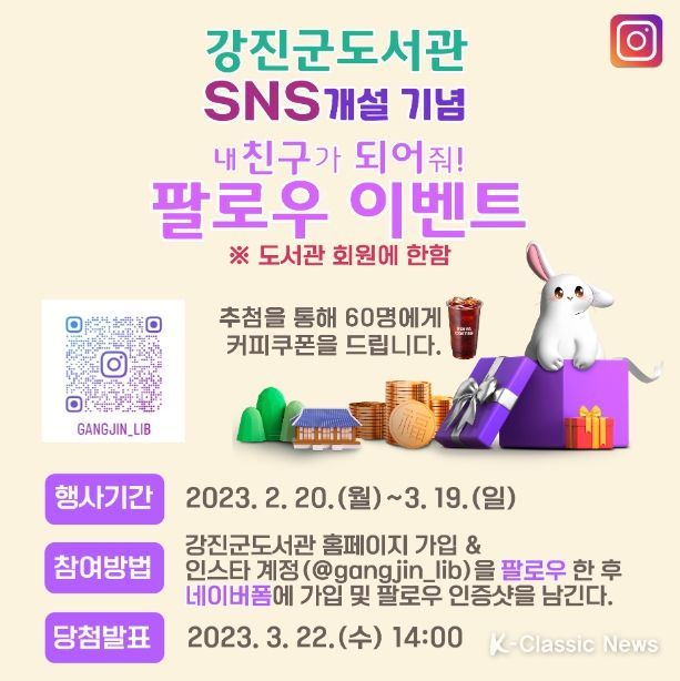 K-Classic News 최지나 기자 | 강진군도서관이 오는 3월 19일까지 강진군도서관 인스타그램 팔로우 이벤트를 진행한다.