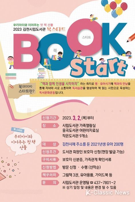 K-Classic News 최지나 기자 | 김천시에서는 오는 3월 2일부터 관내에 거주하는 유아들에게 생애 첫 책 꾸러미를 선물하는 '북스타트'를 운영한다.