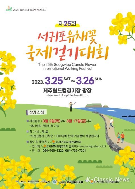 K-Classic News 최지나 기자 | 서귀포의 봄을 느끼며, 유채꽃길을 세계인이 함께 걷는 ‘제25회 서귀포 유채꽃 국제걷기대회’가 오는 3월 25일부터 26일까지 양일간 제주월드컵경기장 광장(주행사장)을 비롯한 서귀포시 일원에서 개최한다.