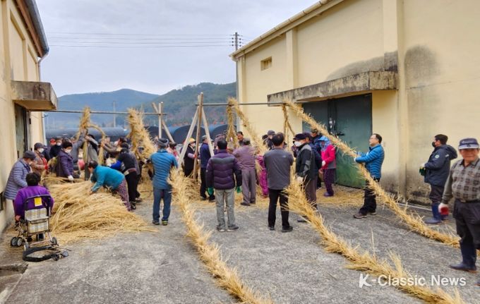 이들은 마을별로 삼삼오오 모여 3월 초까지 작은줄을 만들었고, 지난 10일 우곡마을 창고 앞에서 이장단, 새마을지도자, 체육회 등 주민 100여 명이 참여하여 작은 줄은 엮은 곁줄을 제작 완료했다.