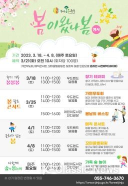 K-Classic News 김성연 기자 | 진주시는 오는 18일부터 4월 8일까지 매주 토요일 봄맞이 문화행사 ‘숲속의 진주 봄이 왔나 봄’을 월아산 숲속의 진주 일원에서 운영한다.