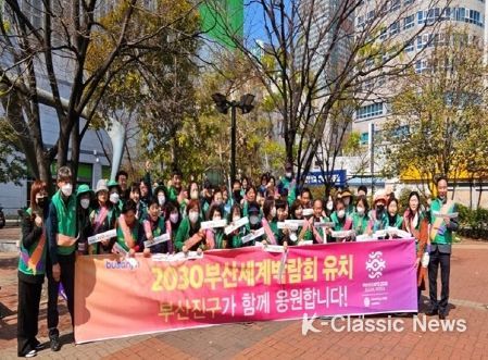 K-Classic News 김성연 기자 | 부산진구새마을회는 지난 28일 오전 11시부터 트레이더스 서면점 앞 사거리에서 2030부산세계박람회 유치 기원 1회용품 줄이기 캠페인을 실시했다.