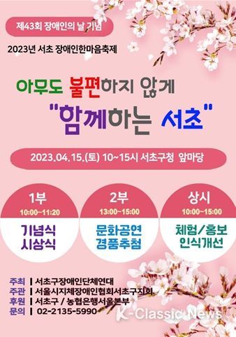 K-Classic News 김성연 기자 | 서울 서초구가 15일 제43회 장애인의 날을 맞이하여 장애인과 비장애인이 함께 즐기는 ‘장애인한마음축제’ 행사를 구청 광장에서 연다.