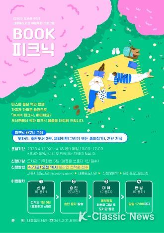 K-Classic News 김성연 기자 | 세종특별자치시 새롬동 도서관이 ‘제59회 도서관 주간’을 맞이해 오는 12일부터 18일까지 매일 다섯 가족을 대상으로 ‘북(BOOK) 피크닉’ 행사를 운영한다.