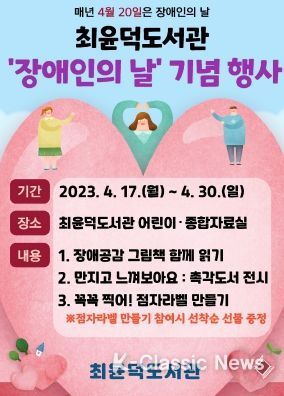 K-Classic News 김성연 기자 | 창원특례시 최윤덕도서관(의창도서관과, 오미숙과장)은 20일 장애인의 날을 맞이하여 ‘장애인의 날’ 기념 행사를 운영한다.