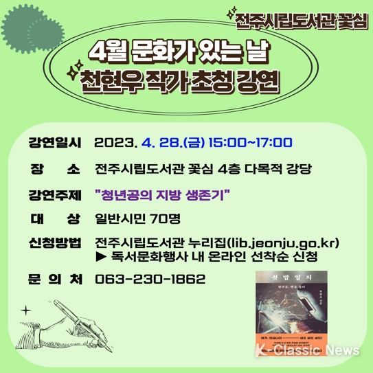 K-Classic News 이호민 기자 | 전주시는 오는 28일 오후 3시 전주시립도서관 ‘꽃심’ 에서 ‘4월 문화가 있는 날 프로그램’의 일환으로 천현우 작가 초청 강연을 개최한다.