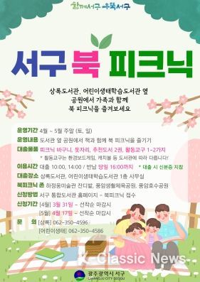 K-Classic News 김성연 기자 | 광주광역시 서구는 시민의 일상 속 독서생활을 지원하기 위해 독서공간을 공원으로 확대하는 ‘서구 북 피크닉(Book Picnic)’사업을 추진한다.