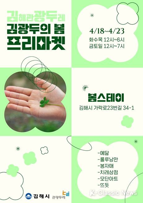 K-Classic News 김성연 기자 | 김해시는 관광두레사업 시행 4년차를 맞아 지역 대표 로컬 여행지인 봉황대길(봄 스테이 갤러리)에서 오는 18일부터 23일까지 김해관광두레 주민사업체 프리마켓 '김광두의 봄'을 개최한다.