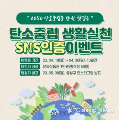 K-Classic News 김성연 기자 | 대전 유성구(구청장 정용래)는 이달 18일부터 30일까지 ‘2050 탄소중립을 향한 첫걸음’을 주제로 탄소중립 생활실천 SNS인증 이벤트를 진행한다고 밝혔다.