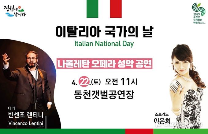 22일은 이탈리아 ‘국가의 날’을 맞아 오전 11시, 나폴레탄 오페라 성악 공연이 열린다. 국가정원 안에는 르네상스 시대 이탈리안 빌라 정원을 모티브로 조성한 이탈리아 정원도 있어 이와 함께 당일, 빈센조 렌티니(테너)와 이은희(소프라노) 공연이 어우러져 마치 유럽에 온 듯한 경험을 선사할 예정이다.