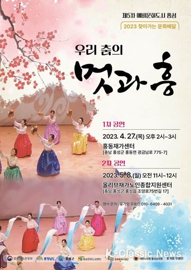 K-Classic News 이호민 기자 | 홍성문화도시센터의 '2023년 찾아가는 문화배달'지원사업에 선정된 꽃가람 무용단의‘우리 춤의 멋과 흥’공연이 오는 27일 2시에 홍동재가센터에서 개최된다.