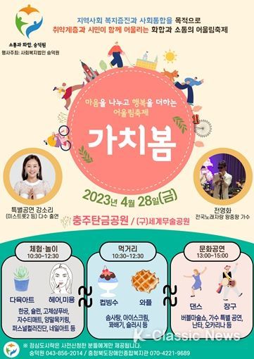 K-Classic News 김성연 기자 | 사회복지법인 숭덕원은 4월 28일 충주탄금공원에서 충주시의 장애인, 아동, 노인 등 사회적 약자들과 지역주민이 함께 할 수 있는 화합과 소통의 장 “마음을 나누고 행복을 더하는 어울림축제 가치봄”을 개최한다.