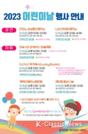 K-Classic News 김성연 기자 | 대구 달서구는 제101회 어린이날을 맞아 달서어린이도서관에서 온 가족이 함께 즐길 수 있는 다채로운 문화행사를 개최한다고 밝혔다.