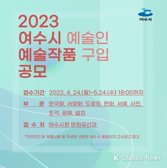 K-Classic News 이호민 기자 | 여수시가 지역작가들의 창작활동을 지원하기 위해 오는 5월 24일까지 ‘지역예술인 작품구입 공모’를 진행한다.