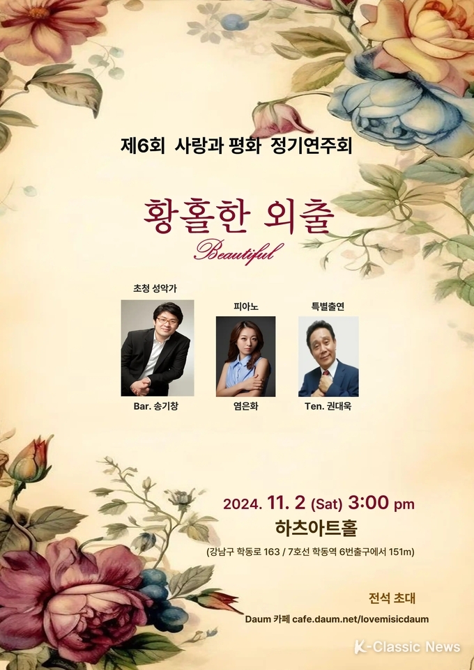누군가 노래를 가슴에 흐르는 강물이라고 했다. 일상의 숨 가쁘고 고단한 삶에서, 가곡의 선율이 강물처럼 흘러간다면, 답답함이나 외로움도 씻을 수 있다. '황홀한 외출'이라니! 그렇다. 초록의 청춘을 지나고, 풍요의 가을을 지나, 그리고 흰 눈이 내리는 벌판에서, 그 황홀의 승화감을 맛볼수 있다니! 인생, 이만하면 훌륭하지 않은가. 땀흘려 준비하지 않은 이들이나 미처 경험의 수련 과정을 겪지 않았다면 누릴 수 없는 보물을 쥔 것이다.