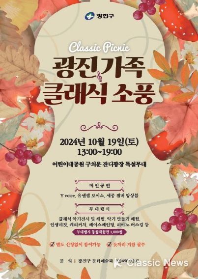 K-Classic News 기자 | 광진구가 19일, 어린이대공원 구의문 잔디광장 특설무대에서 ‘2024 광진가족 클래식 소풍’을 개최한다.